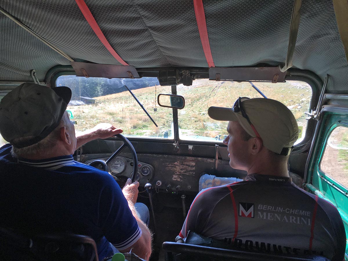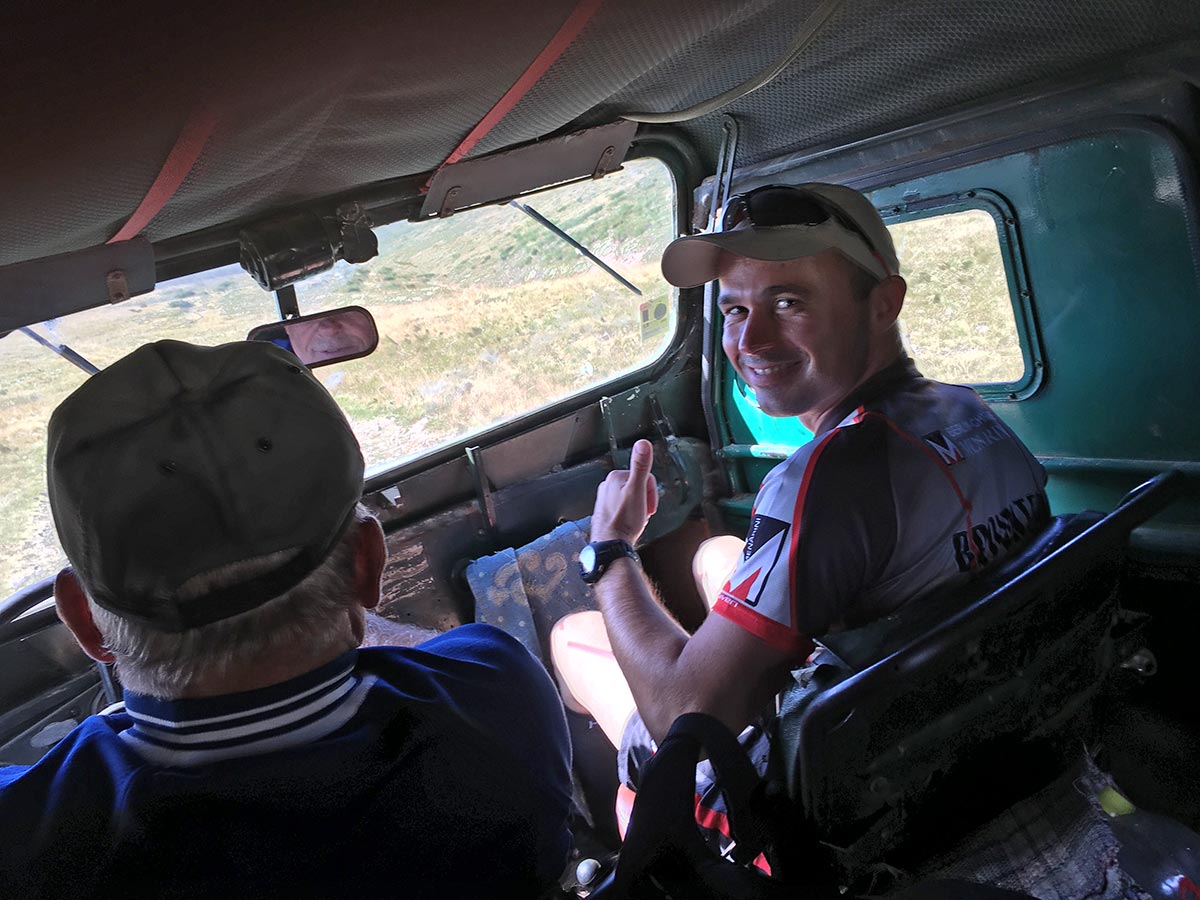 Движехме се по стар планински път, по който си личеше, че някога са извозвали изсечени дървета. От дъжд на вятър отнякъде изникваха кросови мотори и прехвърчаха покрай нас. Лошото беше, че нямаше никакъв начин да ги спрем и попитаме за каквото и да било, а и нашия Бъдко си умираше да си хване гума на мотор (нали ги знаете кучетата). Точно когато седнахме да почиваме и да измислим какво ще правим чух странен звук. Бумтеше и трещеше страшно, но беше автомобил! Представяте ли си! Автомобил! Когато най-сетне се показа разбрахме, че е мощна руска мноогоо ретро машина, направена да оцелява при всякакви условия.