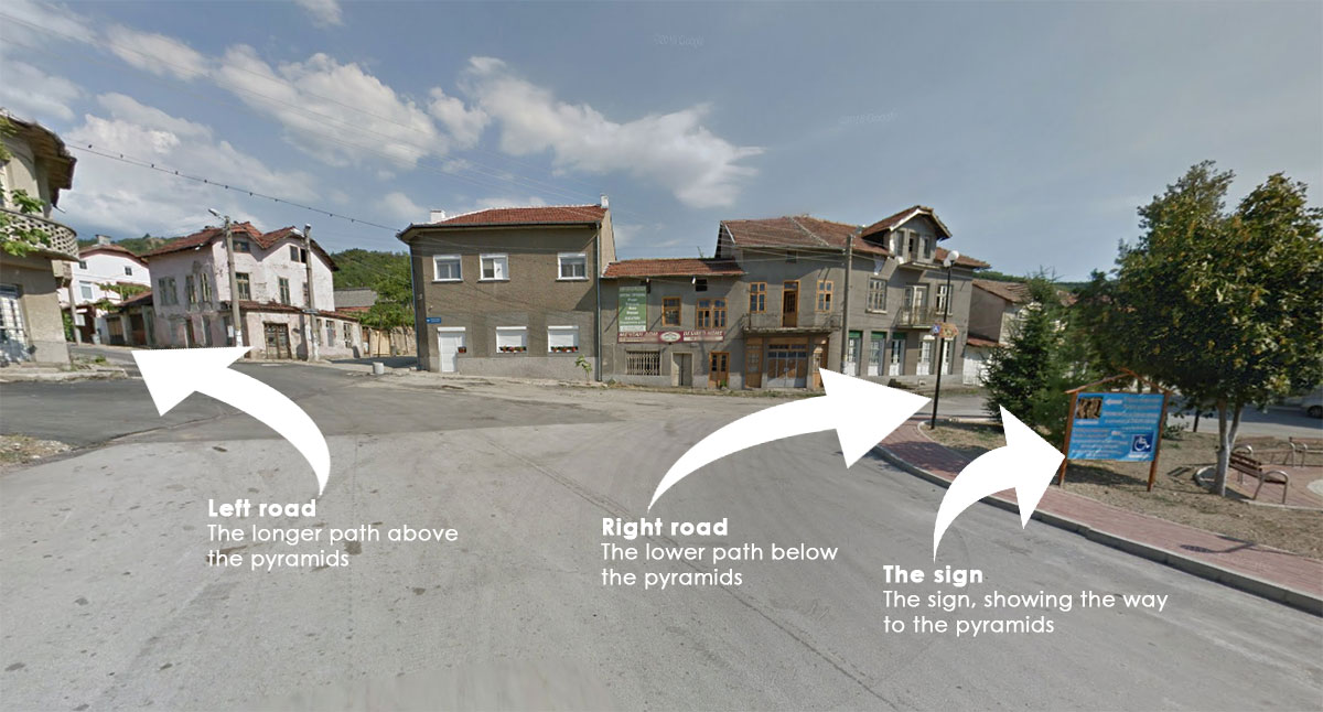 Няколко километра след завоя ще пристигнете в центъра на селото. От там имате две опции. Пътя наляво води към горната пътека, по която можете да се изкачите до върха на пирамидите. Пътя в дясно (както можете да видите на табелата) ще ви насочи към долната. Тя е оптимизирана за инвалиди и възрастни хора и разкрива красива гледка към пирамидите.