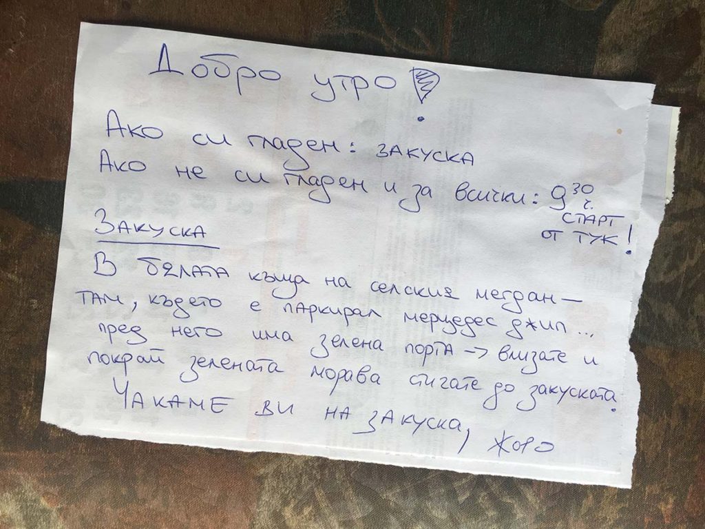 На следващата сутрин, отпочинали и заредили дробовете си с чист въздух, намираме бележка на входа на трапезарията – сутрешна усмивка, която ни отвежда към най-ароматната баница и ни връща 15 години назад във времето с вкуса на истинското кисело мляко. Когато отидете в Зелениград (защото задължително трябва да го направите), поискайте си от тези лакомства. Именно по време на тази закуска разбираме, че къща за гости е почти цялото село.